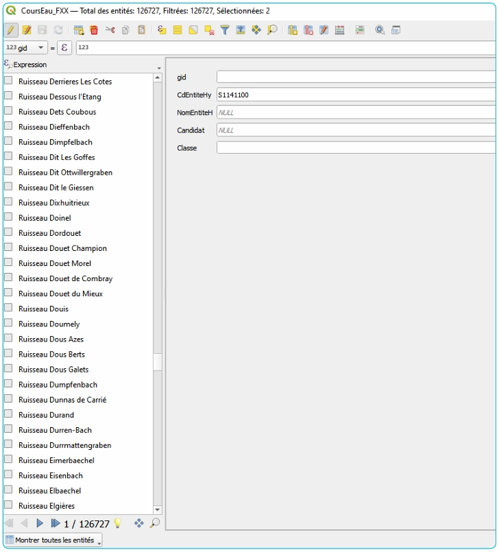 Dans la fenêtre qui s’affiche, on voit que notre couche de données contient 126 727 entités rivières ou fleuves. On souhaite afficher uniquement l’entité rivière Alagnon, affluent de la Loire.
