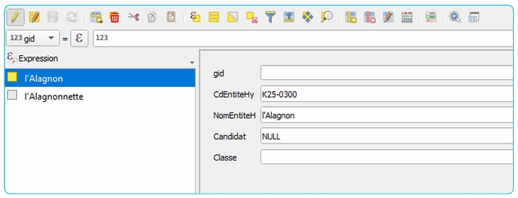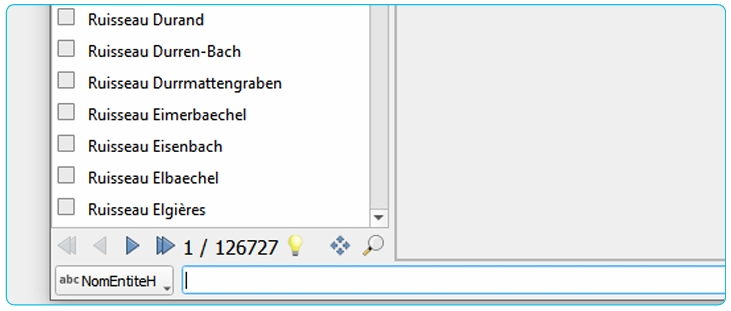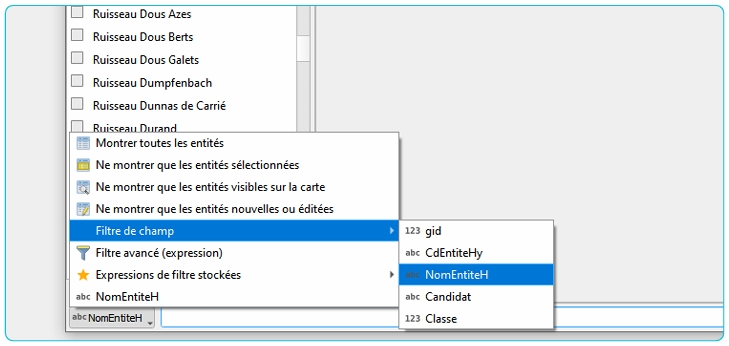 Ecrivez dans le formulaire, en bas de la fenêtre, le nom de l’entité que l’on veut voir afficher seule, par exemple ici « Alagnon », puisque le filtre de champ sélectionné précédemment correspond à l’attribut « NomEntiteH ».