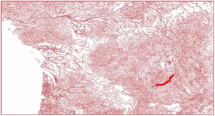 Sur la carte, la rivière apparaît clairement en rouge parmi tous les autres cours d’eau :