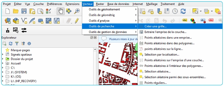 Cliquez dans l’onglet « Vecteur » puis « Outils de recherche » puis « Créer une grille... ».