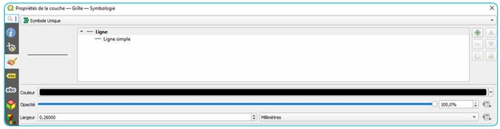 Modifiez la couleur, l’opacité et l’épaisseur du trait de la grille dans le menu « Propriétés de la couche - Symbologie ».