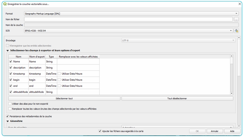 Indiquez un nom de fichier et choisissez le lieu d’enregistrement du fichier KML avec l’icône « … » à droite puis cliquez sur « OK ».