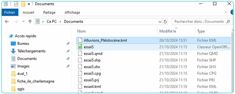 Le fichier KML « Alluvions_Pléistocène.kml » est bien présent dans le dossier d’enregistrement.