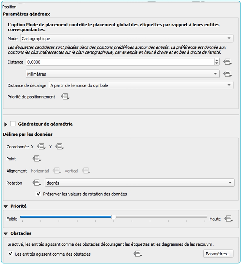 Si des étiquettes ne s’affichent pas à cause d’un chevauchement, possibilité de régler la priorité de l’affichage de la couche avec le menu « Position », comme dans l’extrait ci-dessous :
