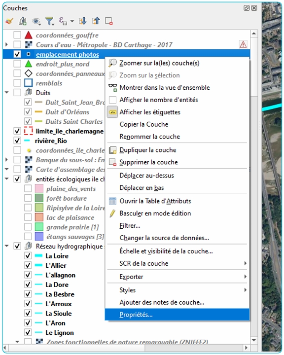 Cliquez-droit sur la couche correspondant aux étiquettes dans la fenêtre « Couches ».