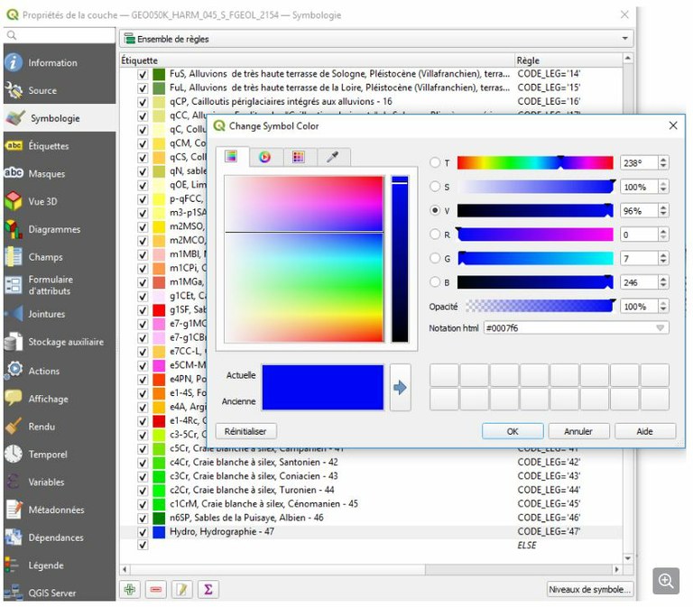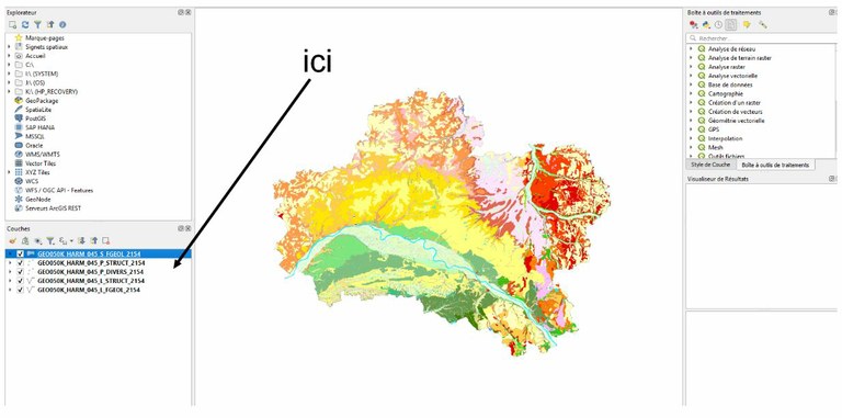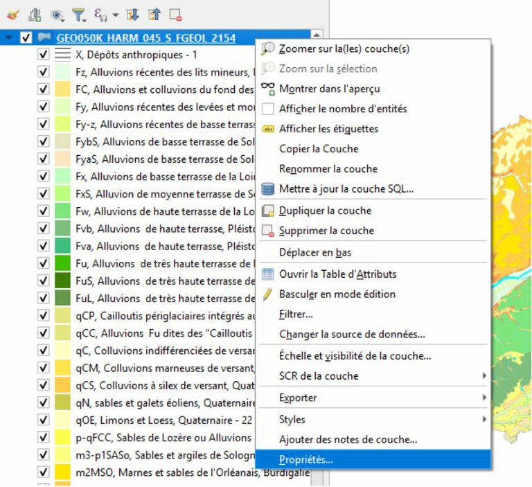 - Pour modifier le code couleur de la légende, cliquez droit sur le domaine géologique (ici GEO050K HARM 045...) dans la fenêtre « Couches », puis cliquez sur « propriétés ».