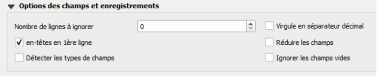 - Cochez « En-têtes en première ligne » (figure ci-dessous) en cohérence avec l'organisation du fichier CSV (légende longitude, latitude écrite en ligne 1).
