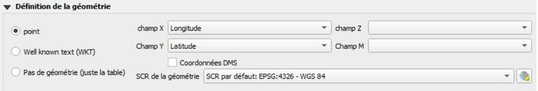 - Spécifiez le format de la géométrie : « SRC par défaut: EPSG:4326 – WGS 84 » (figure ci-dessous)