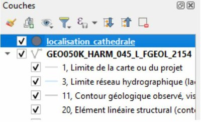 - Possibilité de modifier la forme et la couleur du point : cliquez droit sur le libellé (ici « localisation cathédrale ») dans la fenêtre « Couches » puis « Propriétés ».