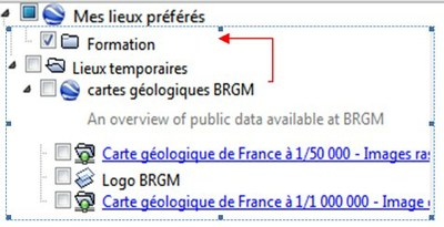 La carte s’installe dans «Lieux temporaires», déplacer le dossier «cartes géologiques BRGM» avec la souris pour le placer dans votre dossier |