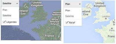 Dans le menu déroulant "Satellite" il est possible de choisir d'autres représentations que celles proposées, avec ou sans relief et avec ou sans légendes.