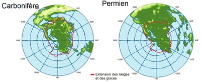 Répartition des neiges et des glaces au Carbonifère et au Permien.