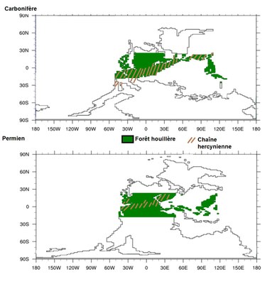 On cherche à mettre en relation les traces d'inlandsis découvertes sur de nombreux continents (Australie, Afrique, Antactique, Amérique du sud ...) et les biomes favorisant la mise en place de dépôts de charbons en Europe avec la position géographique de ces continents à la fin du primaire, le climat qui y régnait et le taux de CO2 atmosphérique.