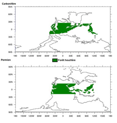 - Représenter, en vert sur les planisphères, la localisation de ce biome au Carbonifère et au Permien.