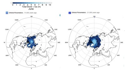 L'étude des surfaces glacées ou enneigées entre ces deux épisodes montrent bien la différence des climats (ci-dessous extension en juin à 11 et 21 kans au pôle nord).
