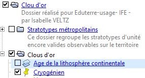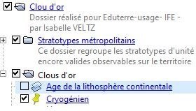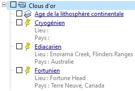 - Cocher la case devant le dossier Clous d'or et décocher le dossier "stratotypes métropolitains" et "Age de la lithosphère continentale" comme ci-contre afin de n'avoir que les punaises des clous d'or affichés.