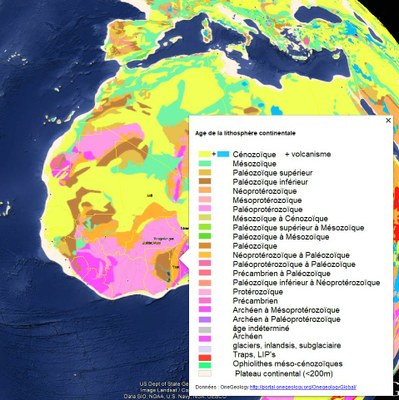 - Pour connaître l'âge des terrains cocher la case devant "Age de la lithosphère continentale", pour faire apparaitre la légende cliquer sur "Age de la lithosphère continentale"; penser à la décocher si vous en avez pas besoin.