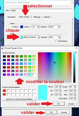 - Cliquer sur l'onglet "Style et couleur" cliquer sur "zone" puis modifier la couleur en respectant les consignes suivantes. Valider 2 fois.