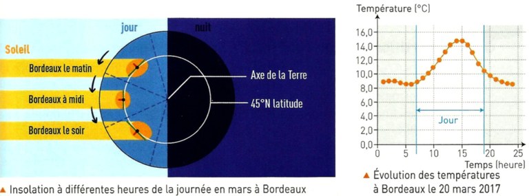 Fig. 1. Variations journalières d’insolation et de température (manuel enseignement scientifique, éditions Hachette, 2019 ; p. 73).