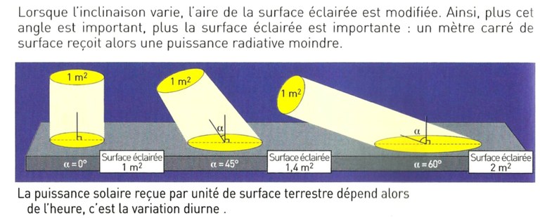 Fig. 2. Inclinaison du rayonnement incident et aire de la surface éclairée (manuel enseignement scientifique, éditions Hachette, 2019 ; p. 74).