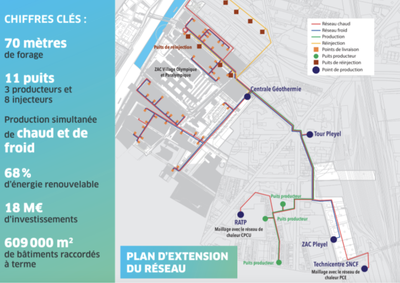 Des panneaux photovoltaïques ont été installés sur des toitures comme celle du centre aquatique olympique et une centrale géothermique a été construite dans le quartier Pleyel pour favoriser les énergies durables pendant les jeux olympiques et paralympiques mais aussi et surtout pour les générations futures. La centrale géthermique du quartier Pleyel est alimentée par 11 puits geothermiques. Le Village des Athlètes est alimenté par un réseau chaud-froid avec une énergie issue à 68% de la géothermie. Cela évitera l'émission de plus de 4500 tonnes de CO2. Après les Jeux Olympiques et paralympiques, elle pourra chauffer et rafraîchir 600 000 m2 de bureaux et logements. |