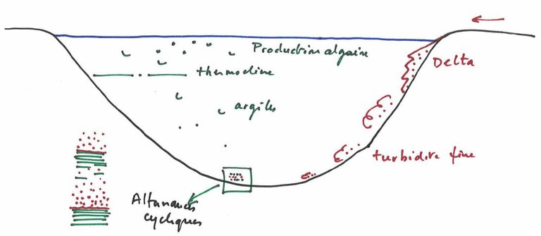 La transition entre un lit sombre et un lit clair est nette, bien marquée mais parfois irrégulière alors que la transition entre clair/sombre est plus diffuse (limite progressive). On en déduit une granodécroissance du sable depuis la base du lit qui pourrait alors correspondre à une arrivée brutale de matériel détritique dans un environnement calme où sédimentent les argiles et la matière organique. La répétition des lits conduit à envisager une sédimentation rythmique ou cyclique de type varve (si la périodicité saisonnière pouvait être prouvée) ou de type turbidite fine (figure 28 ci-dessous).