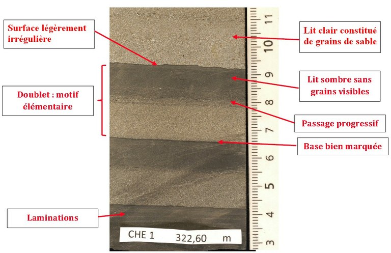 Fig. 28. Schéma explicatif des faciès silicoclastiques présents à ~322,6 m de profondeur dans la carotte CHE 1. Une sédimentation cyclique conduit à la superposition de lits clairs et sombres.