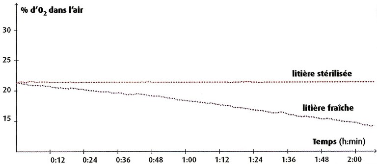 ► Fig 20. Expérience d'ExAO mettant en évidence la respiration des vivants de la litière sur le sol (Belin, seconde, 2010).