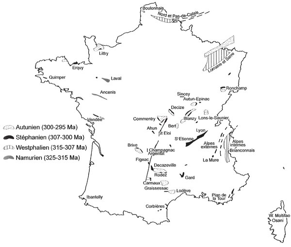 Fig. 36. Répartition des bassins houillers français métropolitains avec indication des âges (Baudin, Tribovillard, Trichet, 2017). Ceux datant du Namurien (325-315 Ma) et du Westphalien (315-307 Ma) correspondent à des charbons déposés en bordure d’un littoral marin (charbons paraliques du Carbonifère) alors que ceux du Stéphanien (307-300 Ma) et de l’Autunien (300-295 Ma) se sont déposés dans de petites bassins lacustres (charbons limniques de du Carbonifère et du Permien). |