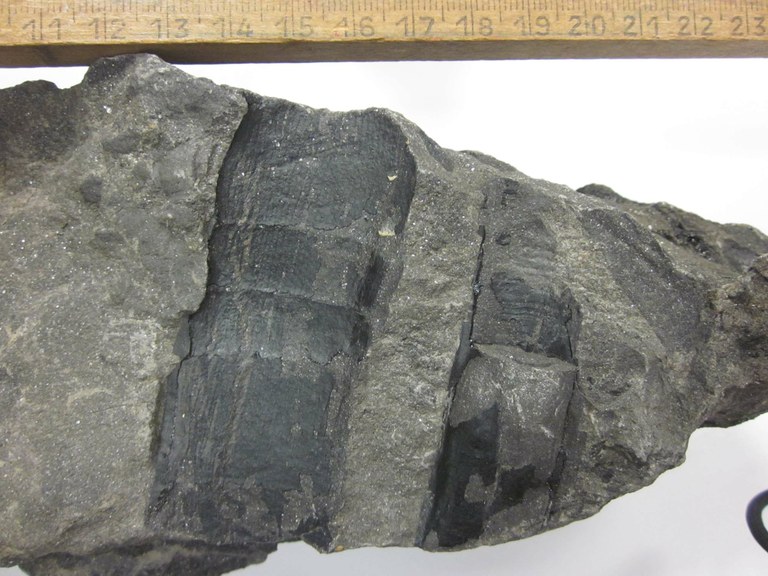 - La couleur sombre de/dans ces roches est un des points communs de ce groupe lithologique. Poser les questions : Quelles sont les caractéristiques de ces roches ? Des roches aussi anciennes peuvent-elles être constituées d’une autre matière que minérale ? Amener au fait qu'elles se caractérisent notamment par une richesse plus ou moins importante en matière organique.