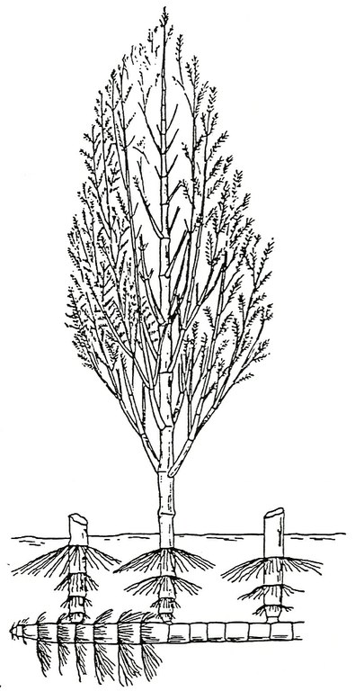 Calamites est une forme arborescente de prêle atteignant jusqu’à 18 m. Comme les prêles actuelles, Calamites a un appareil végétatif formé d’une tige principale portant des verticilles de rameaux latéraux ramifiés. La partie souterraine est formée de tiges horizontales (rhizomes) sur lesquels des racines adventives se développent au niveau des nœuds. |