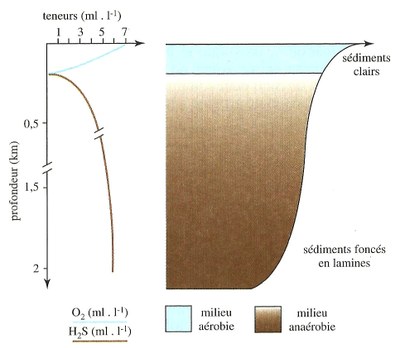 Ainsi, dans l'eau, les endroits de haute productivité organique correspondent à des zones d'upwelling (par exemple près des côtes du Pérou) ou à des bassins fermés (type Mer Noire, fig. 25). Sur les continents, le potentiel de fossilisation est très faible excepté dans les tourbières (~ 50% C org).