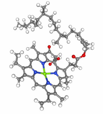 | Fig 17. Chlorophylle A avec extrémité phytol et anneau porphyrine (modèle moléculaire LibMol). | Fig 18. Molécule de phytane. Présence dans le pétrole (modèle moléculaire LibMol). |