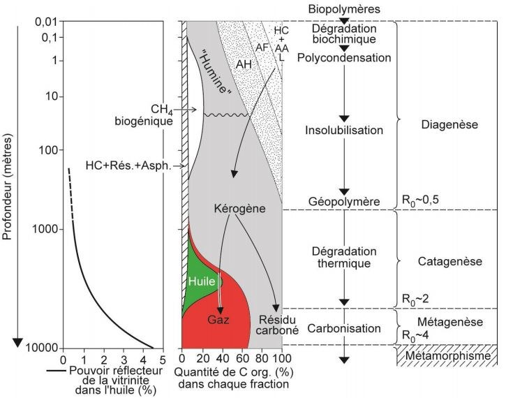 Bilan 8 : Les divers composants la matière organique piégée (biopolymères) sont minéralisés en géopolymères, le kérogène, au cours de la diagenèse précoce. Trois types de kérogènes sont distingués par les rapports atomiques H/C (2 à 0.75) et O/C (0.05 à 0.4) et en fonction d'une origine qui est soit algaire marine, algaire lacustre ou bien végétale en milieu côtier et marécageux. Les kérogènes s'enrichissent en carbone lors de l'enfouissement et, après la diagenèse précoce, ils subissent la dégradation thermique en catagenèse et une carbonisation lors de la métagenèse. Cette évolution, liée à l'enfouissement et au gradient géothermique, fait que la formation des hydrocarbures est limitée à certains domaines de pression et de température, comme par exemple la fenêtre à huile.