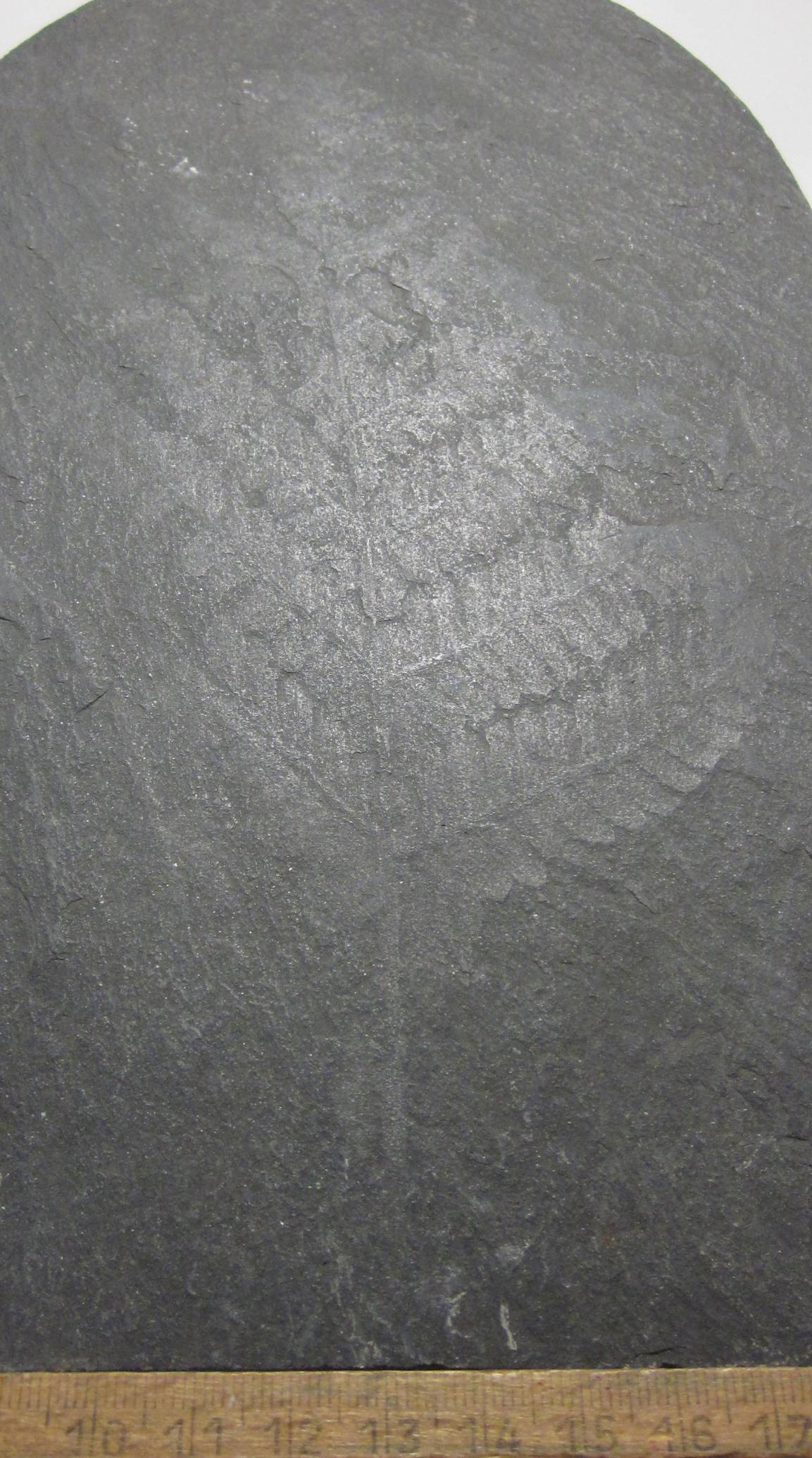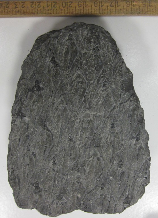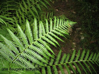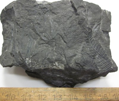 Photo 12. Roche avec trace de limbe de fougère. Présence d'un rachis secondaire qui portent les parties foliarisées appelées pennes. Un modèle actuel correspond au polypode vulgaire (Polypodium vulgare). |