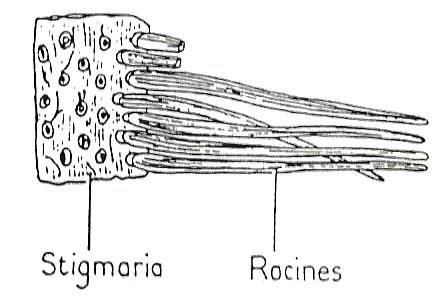 La fixation au sol du lépidodendron est assurée par des organes souterrains qui s’étalent superficiellement et se ramifient dichotomiquement ; ces organes appelés stigmaria par les géologues portent des racines insérées suivant une spirale ; racines qui, comme les feuilles, sont caduques et disparaissent au bout d’un certain temps en laissant des traces caractéristiques sur les stigmarias. Ces stigmarias sont interprétés comme des tiges modifiées qui s’enfoncent dans le sol et portent des racines. On les appelle rhizophores. Ils représentent une adaptation plus poussée de l’appareil végétatif à la vie terrestre en améliorant la nutrition hydro-minérale, en ancrant le végétal plus solidement dans le sol et lui permettant d'atteindre une dimension importante. Bien qu’ayant l’aspect d’arbre, les lépidodendron sont des plantes herbacées arborescentes. |