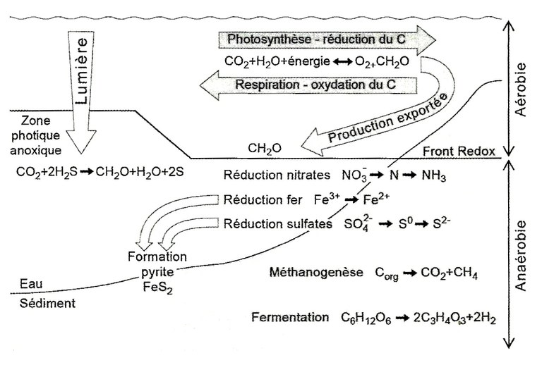 Fig. 21. Représentation de la dégradation sous-marine de la matière organique sous l'action des bactéries aérobies et anaérobie, ainsi que des organismes vivant dans le sédiment (d'après Baudin, Tribovillard, Trichet, 2017). |