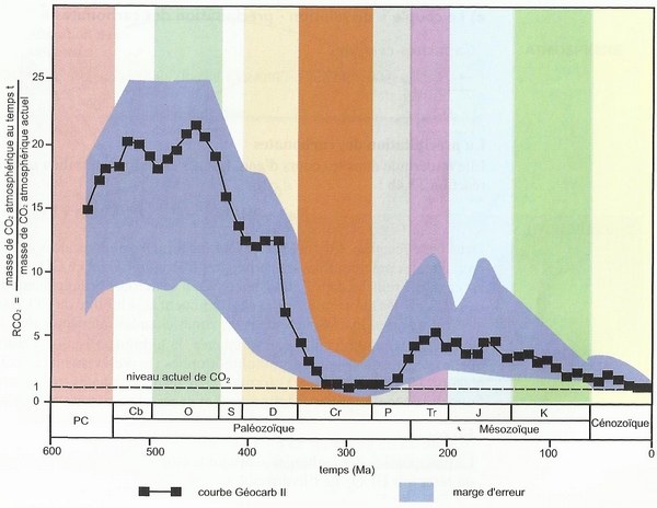 Fig. 37. Modèle d'évolution de la teneur atmosphérique en CO2 au cours du Phanérozoïque (Biologie tout-en-un BCPST 2e année, Peycru). |