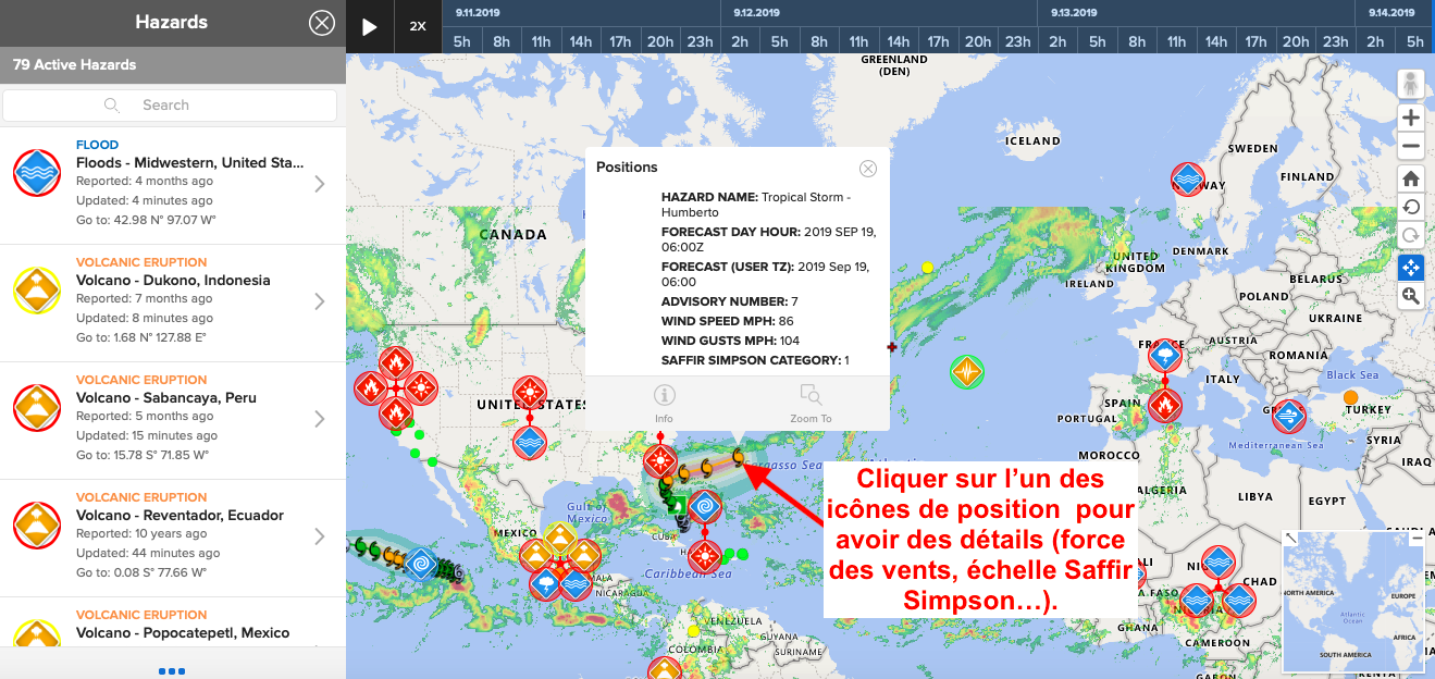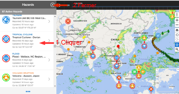 A l'ouverture du site apparait la liste des derniers événements : 1) cliquer sur l'événement recherché puis 2) fermer "Hazards"