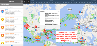 Le site "disasteralert" : https://disasteralert.pdc.org/disasteralert/ permet en temps réel de visionner les lieux et données à l'échelle planétaire sur : des incendies, inondations, cyclones, séismes et tsunamis, volcanisme ..