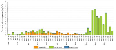 Les données relatives à la contamination de l'air par les pesticides demeurent fragmentaires. Alors que lors de leur utilisation, les substances actives peuvent être transférées dans l’atmosphère par le vent, l’érosion éolienne et la volatilisation, il n’existe pas de valeur réglementaire dans l’air. Au niveau national, sur les sites permanents et la période 2015-2017, on constate la présence des substances actives suivantes : Herbicides : • Pendiméthaline • Triallate • s-Métolachlore • Prosulfocarbe • Diméthénamide(-p) Les concentrations en pesticides dans l’air varient selon les saisons et selon les cultures. |