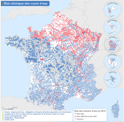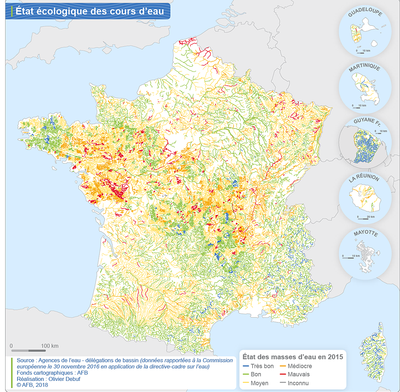 Protections de la ressouce en eau :La directive-cadre sur l'eau a imposé de découper le territoire national en masses d’eau souterraine. L’état d’une masse d’eau souterraine est déterminé par la plus mauvaise valeur de son état quantitatif et de son état chimique. Sur le plan quantitatif, une masse d’eau souterraine est en bon état lorsque les volumes prélevés dans la nappe ne dépassent pas la capacité de renouvellement de la ressource . Sur le plan qualitatif (état chimique), les déclassements des masses d’eau souterraine sont principalement dus aux nitrates et pesticides d’origine agricole. Mesures de protection : - Périmètres de protection autour des captages d’eau contre les pollutions locales, ponctuelles et accidentelles. - Bandes naturelles enherbées obligatoires entre les zones agricoles et les cours d’eau, pour filtrer les pollutions provenant des champs. Grenelle II 2010 -Pesticides interdits dans les espaces verts en 2017 et les jardins en 2019 Difficultés rencontrées : Il n’existe pas de définition légale et unique de ce qu’est un cours d’eau et la Fédération Nationale des Syndicats d’Exploitants Agricoles (FNSEA),s’est lancée dans une « opération de simplification » des normes sur les milieux aquatiques qui entraine la disparition de milliers de ruisseaux qui sont ainsi en train d’être purement et simplement rayés de la carte de France. |