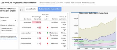 Dataviz : Un outil de visualisation qui retrace l’évolution des ventes de produits phytosanitaires par département ( 2008 – 2018) et qui renseigne sur la répartition des achats à l’échelle du code postal pour la période la plus récente (2015-2018).