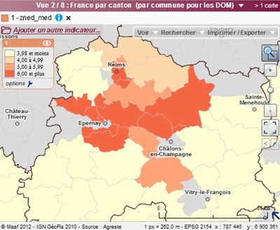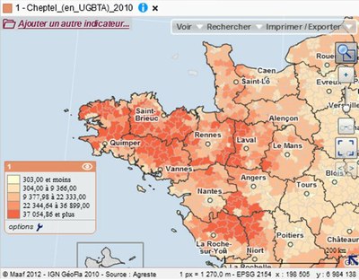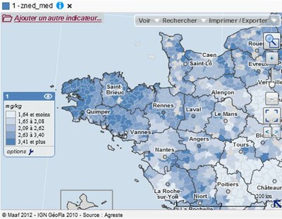 Ces données sont cartographiables avec la base de données Géoidd (Géographie et indicateurs liés au développement durable) qui propose un affichage par petites régions agricoles (PRA) en sélectionnant "France métropolitaine" dans le menu à gauche.