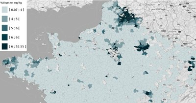 Fig. 1. Extrait de la carte des teneurs médianes en zinc des cantons. Les couleurs les plus foncées des teneurs en zinc masquent des disparités importantes sur le territoire |