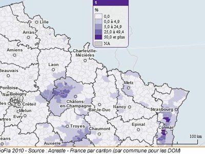 Fig. 2. Extrait d’une carte dont l’échelle a été modifiée. Quatre zones principales apparaissent : en région parisienne, dans les Hauts de France, en Champagne et en Alsace. |