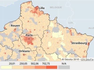 Fig. 5. Densité moyenne de la population (hab/km²) en 2015. Les agglomérations de paris et Lille-Roubaix-Tourcoing apparaissent correspondre aux deux autres zones dont les sols ont des teneurs élevées en zinc. |