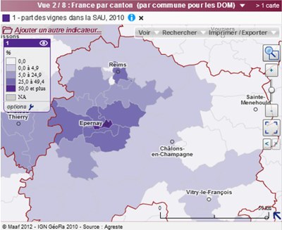 Fig. 4. Part des vignes dans la superficie agricole utilisée en 2010. Des cantons en Champagne et en Alsace correspondent à deux des zones géographiques aux teneurs importantes en zinc. |