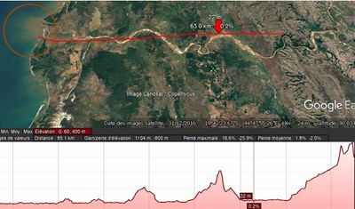 On constate que la pente permet l'évacuation des sédiments vers la mer, La coloration brune de l'eau indique la présence de sédiments à l'embouchure. |