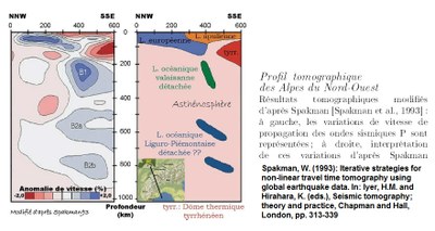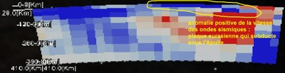 On observe le lambeau de croûte océanique qui s'enfonce dans l'asthénosphère à droite de la tomographie.